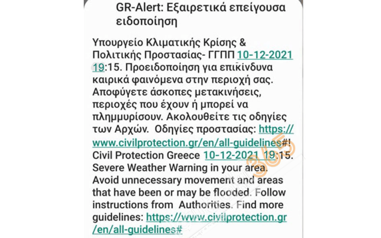 Στο μεταξύ χτες, μήνυμα από το 112 έφτασε στα κινητά κατοίκων σε διάφορες περιοχές της Κορινθίας. Το μήνυμα στάλθηκε σε κατοίκους των δήμων Λουτρακίου – Αγίων Θεοδώρων, Κορίνθιων και Ξυλοκάστρου Ευρωστίνης με την προειδοποίηση ότι αναμένονται έντονα καιρικά φαινόμενα στο πλαίσιο της κακοκαιρίας, τόσο στην διάρκεια της νύχτας (ξημερώματα Σαββάτου), όσο και όλο το Σάββατο.