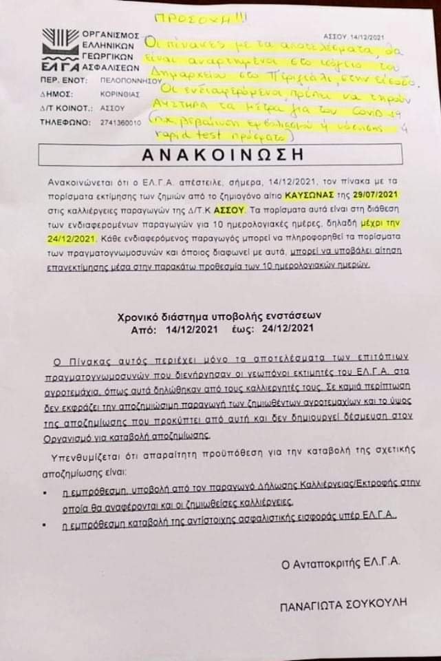 ΑΝΑΚΟΊΝΩΣΗΑνακοινώνεται οτι ο ΕΛΓΑ απέστειλε σήμερα 14/12/2021 τον πίνακα με τα πορίσματα εκτιμήσεις τον ζημιών από το ζημιογόνο αίτιο ” ΚΑΎΣΩΝΑΣ ” της 29/7/2021 στις καλλιέργειες παραγωγών της Τ.Κ Άσσου.