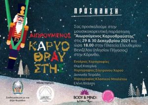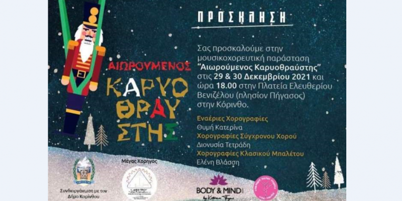 Στις 29 και 30 Δεκεμβρίου 3 Κορίνθιες χορογράφοι, η Έλενα Βλάσση, η Διονυσία Τετράδη και η Κατερίνα Θυμή παρουσιάζουν μια ξεχωριστή παράσταση που συνδυάζει κλασσικό μπαλέτο, εναέρια χορογραφία και σύγχρονο χορό στην Πλατεία Ελ. Βενιζέλου στην Κόρινθο.