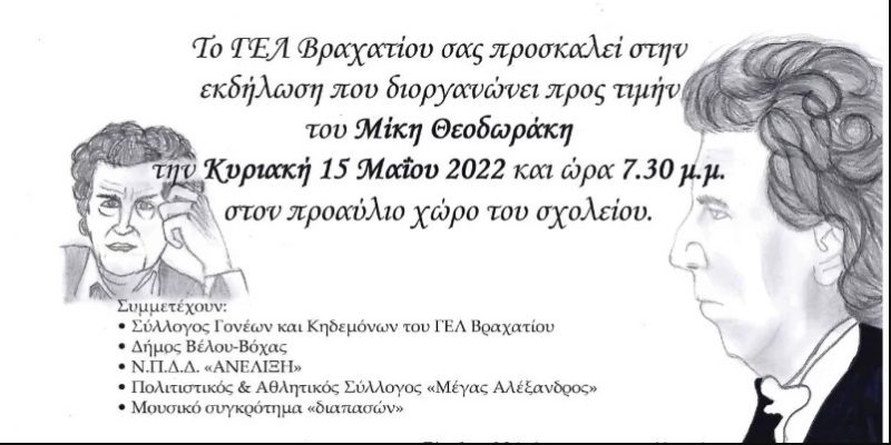 Την Κυριακή 15 Μαϊου 2022 και ώρα 7.30 μ.μ. το Γενικό Λύκειο Βραχατίου διοργανώνει εκδήλωση στη μνήμη του Μίκη Θεοδωράκη.