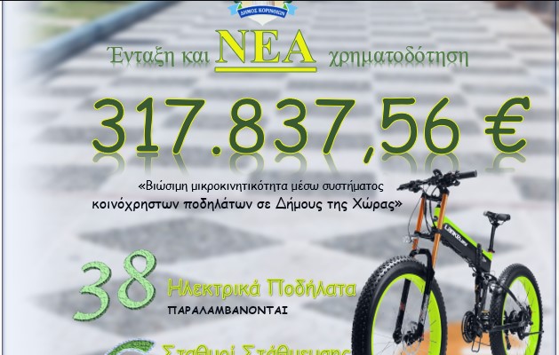 Μια ακόμα χρηματοδότηση ύψους 317.837,56 € από το Πρόγραμμα: «Βιώσιμη μικροκινητικότητα μέσω συστήματος κοινόχρηστων ποδηλάτων σε Δήμους της Χώρας» υποδέχεται ο δήμος Κορινθίων, απόρροια της συνεχούς και στοχευμένης δουλειάς που έγινε τους προηγούμενους μήνες και στόχο την αναβάθμιση της ποιότητας ζωής των πολιτών και την προστασία του περιβάλλοντος.