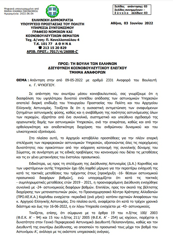 Μετά την παρέμβαση του βουλευτή Κορινθίας ΣΥΡΙΖΑ-ΠΣ, Γ. Ψυχογιού στη Βουλή, για την απόφαση του Υπουργείου Προστασίας του Πολίτη να διακόψει την ενίσχυση της Δ.Α.Κορινθίας με σαράντα αστυνομικούς από 09-05-2022 και επειδή, τόσο το δικαίωμα στην ασφάλεια πολιτών, επαγγελματιών και επισκεπτών της Κορινθίας, όσο και η κατοχύρωση των εργασιακών δικαιωμάτων και αξιοπρεπών συνθηκών για τους αστυνομικούς που υπηρετούν και εν μέσω πανδημίας χωρίς διακοπή, είναι βασικές υποχρεώσεις της Πολιτείας που απορρέουν από το ίδιο το Σύνταγμά μας, δημοσιεύουμε προς ενημέρωση όλων την απάντηση του αρμόδιου Υπουργείου μετά την παρέμβαση του βουλευτή: