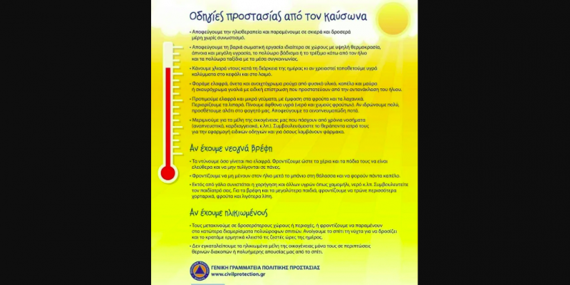Εν όψει του επερχόμενου καύσωνα επιβάλλεται η λήψη προληπτικών μέτρων προκειμένου να αποφευχθεί η θερμική καταπόνηση των εργαζομένων που οφείλεται στους μετεωρολογικούς παράγοντες σε συνδυασμό με το μικροκλίμα των εργασιακών χώρων και τις συνθήκες εργασίας.