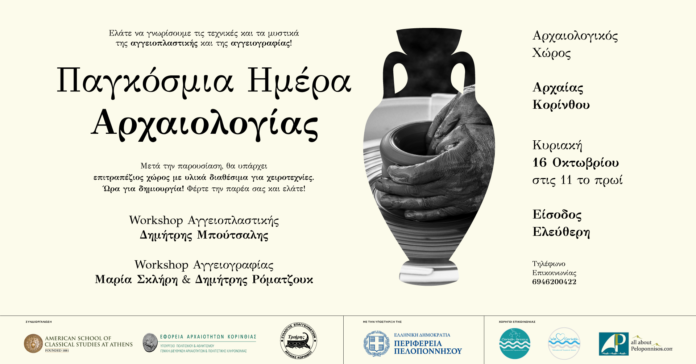 Όσοι θέλετε να μάθετε τα μυστικά της αγγειογραφίας , την αγγειοπλαστική, να δείτε από κοντά Κορινθιακά αγγεία αλλά και να δημιουργήσετε τις δικές σας κατασκευές, τότε πρέπει να επισκεφθείτε την Αρχαία Κόρινθο, αυτή την Κυριακή 16 Οκτωβρίου όπου εκεί, με αφορμή την Παγκόσμια Ημέρα Αρχαιολογίας, η Αμερικανική Σχολή Κλασικών Σπουδών στην Αθήνα -Ανασκαφές Κορίνθου, σε συνεργασία με την Εφορεία Αρχαιοτήτων Κορινθίας και με την υποστήριξη του Συλλόγου Επαγγελματιών Αρχαίας Κορίνθου – ΣΕΑΚ, διοργανώνουν ένα εκπαιδευτικό πρόγραμμα για μικρούς και μεγάλους. Αρχαιολογικός χώρος Αρχαίας Κορίνθου, Κυριακή 16 Οκτωβρίου ώρα 11:00 το πρωί.