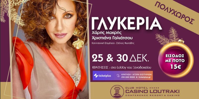 Το Club Hotel Casino Loutraki, υποδέχεται μία από τις πιο σπουδαίες λαϊκές φωνές της Ελλάδας. Η χαρισματική ερμηνεύτρια Γλυκερία έρχεται στον Πολυχώρο του Casino Loutraki για 2 μουσικές εμφανίσεις.