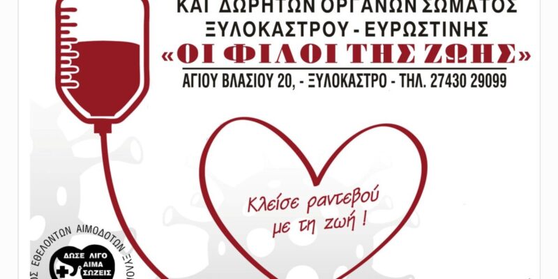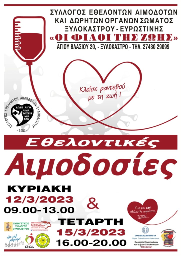 Για το λόγο αυτό, ο Σύλλογος Εθελοντών Αιμοδοτών Ξυλοκάστρου – Ευρωστίνης «Οι Φίλοι της Ζωής» σε συνεργασία με τον Δήμο Ξυλοκάστρου – Ευρωστίνης, τον Εμπορικό Σύλλογο, τον Κυλλήνιο Άδωνι, τον Κυνηγετικό Σύλλογο και το Σωματείο Εργαζομένων του Δήμου Ξυλοκάστρου – Ευρωστίνης «Η Ενότητα» πραγματοποιούν Εθελοντικές Αιμοδοσίες στα γραφεία μας, στην οδό Αγίου Βλασίου 20, στο Ξυλόκαστρο, την Κυριακή 12/03/2023, 09.00 – 13.00 & την Τετάρτη 15/03/2023, 16.00 – 20.00