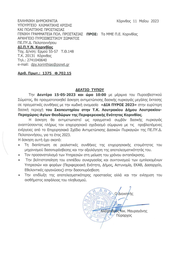ΚΟΙΝΩΝΙΑ Η Πυροσβεστική την Δευτέρα 15 Μαίου θα πραγματοποιήσει άσκηση μεγάλης έκτασης στο Λουτράκι By sikionia 14/May/2023 Share 0 Η Πυροσβεστική την Δευτέρα 15 Μαίου θα πραγματοποιήσει άσκηση μεγάλης έκτασης στο Λουτράκι.