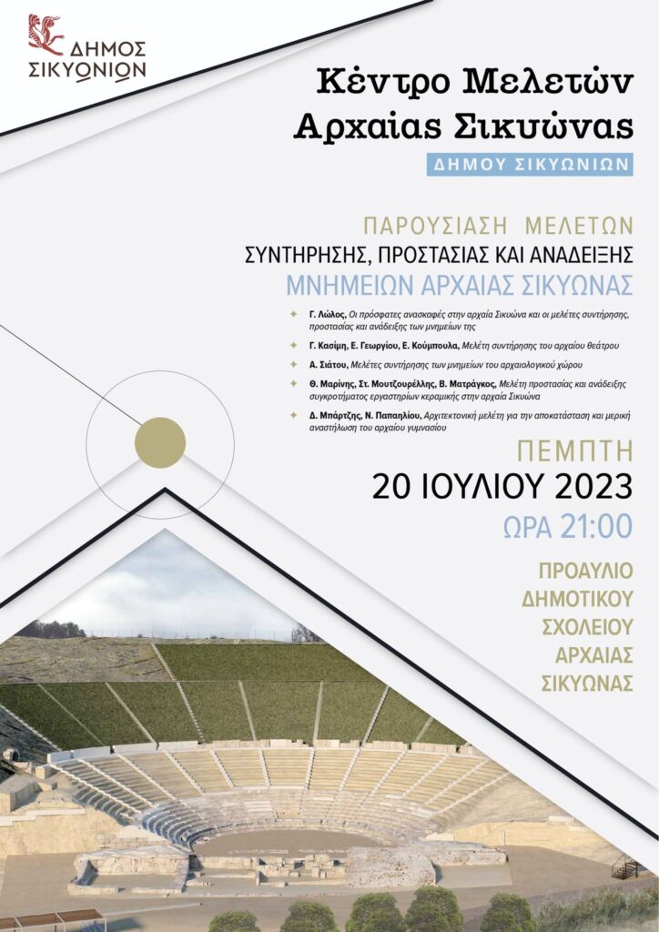 Την Πέμπτη 20 Ιουλίου 2023, το Κέντρο Μελετών Αρχαίας Σικυώνας του Δήμου Σικυωνίων σάς καλεί στην Παρουσίαση των Μελετών Συντήρησης, Προστασίας και Ανάδειξης των Μνημείων της Αρχαίας Σικυώνας.