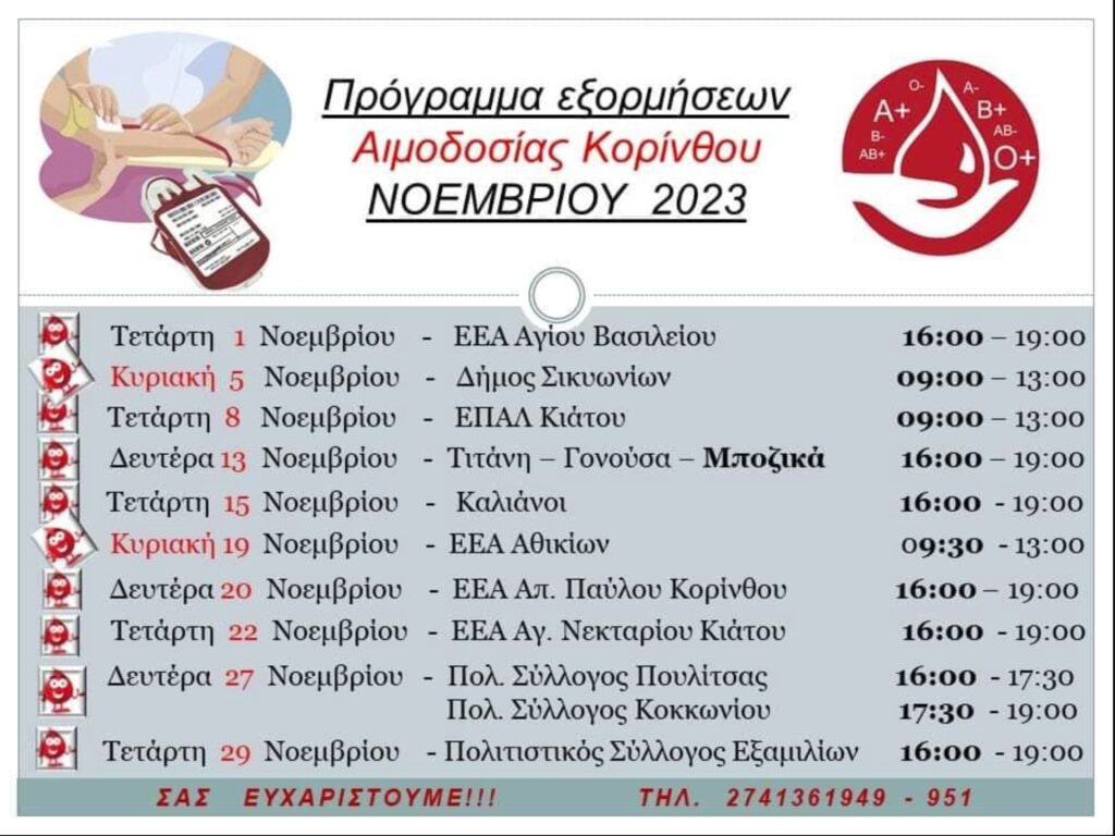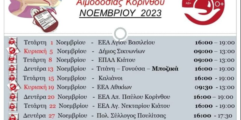 ΚΟΙΝΩΝΙΑ Τον Νοέμβριο η Κορινθία δίνει αίμα – Εσείς σε ποια αιμοδοσία θα δώσετε το παρόν; By sikionia 01/November/2023 Share 0