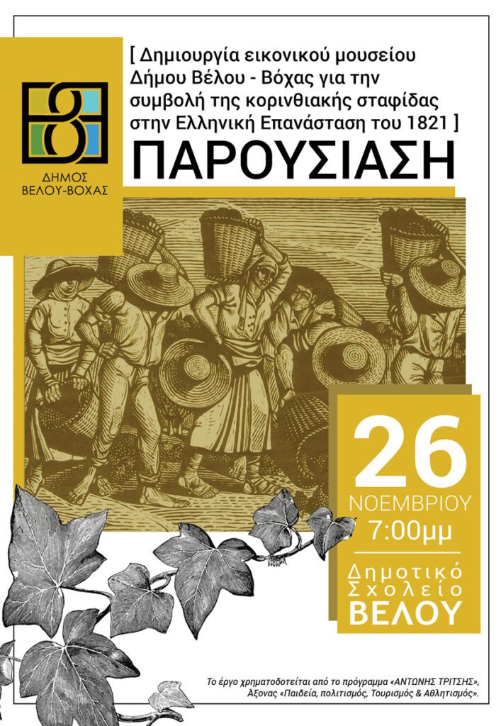“Την Κυριακή 26 Νοεμβρίου και ώρα 7.00 μ.μ. στην αίθουσα πολλαπλών χρήσεων του Δημοτικού Σχολείου Βέλου θα πραγματοποιηθεί η παρουσίαση του εικονικού μουσείου του Δήμου Βέλου Βόχας για την συμβολή της κορινθιακής σταφίδας στην Ελληνική Επανάσταση του 1821″, αναφέρεται από το δήμο Βέλου- Βόχας.