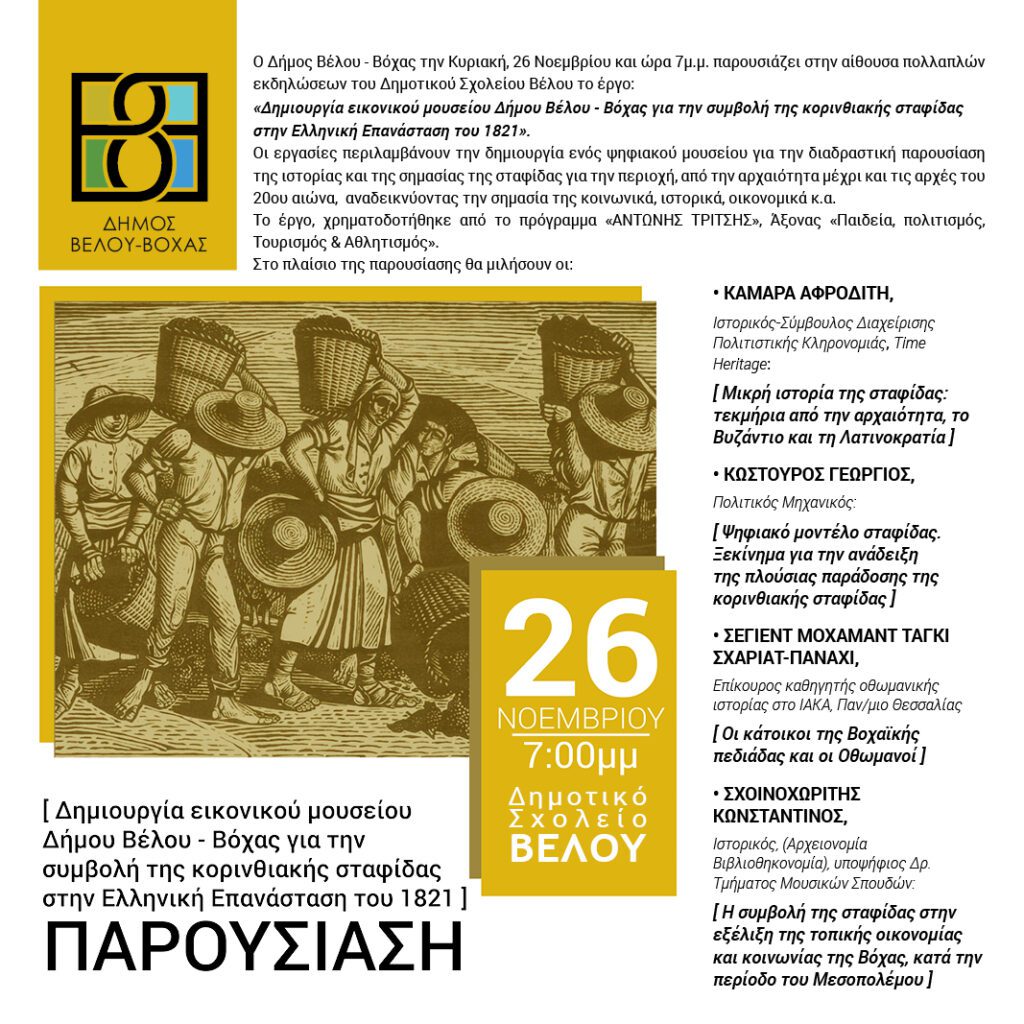 «Δημιουργία εικονικού μουσείου Δήμου Βέλου – Βόχας για την συμβολή της κορινθιακής σταφίδας στην Ελληνική Επανάσταση του 1821».