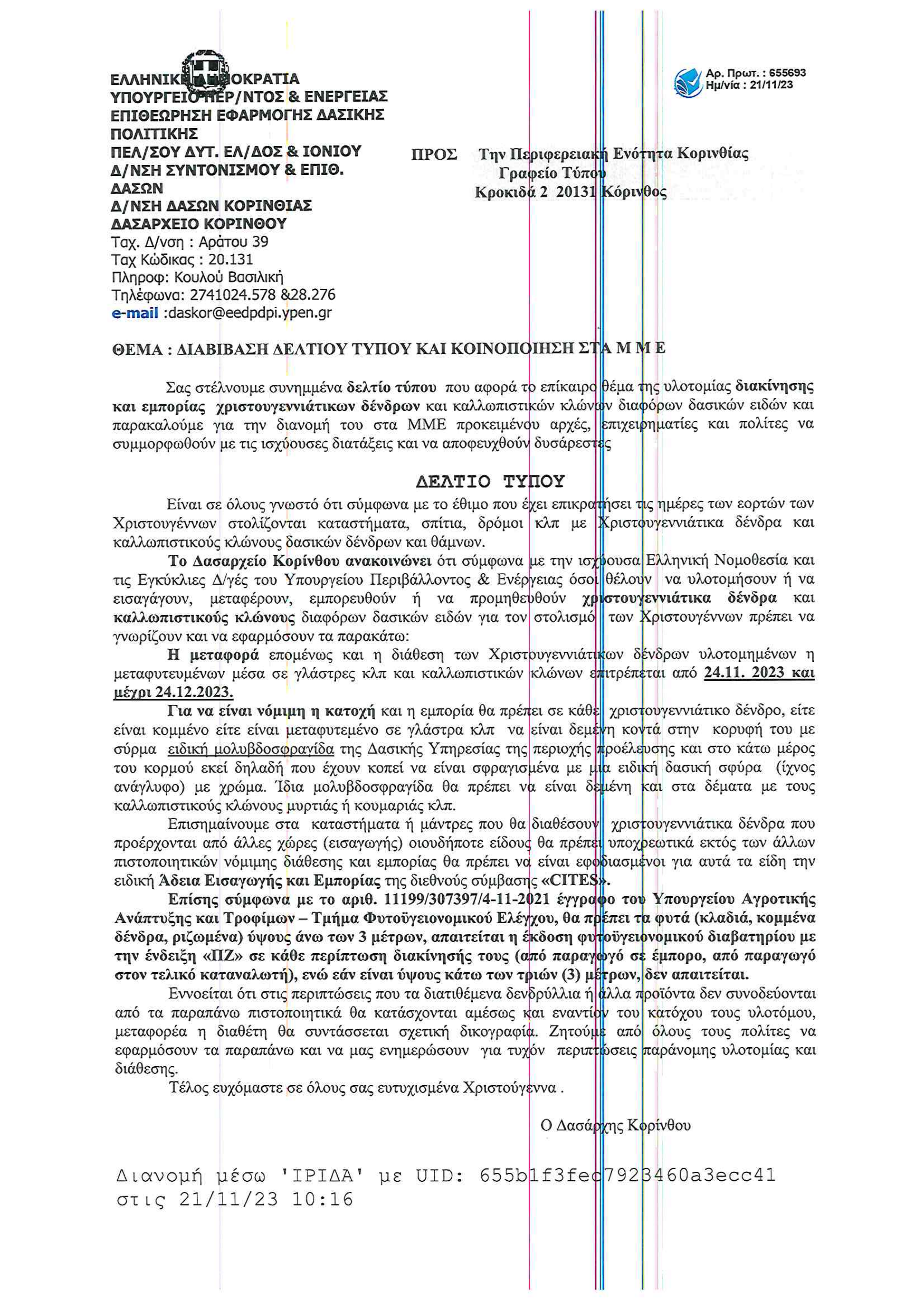 “Το Δασαρχείο Κορίνθου ανακοινώνει ότι σύμφωνα με τις αριθ. 111972/1640/01-07-2014 εγκύκλιο διαταγή του Υπουργείου Περιβάλλοντος & Ενέργειας περί «Δυνατότητα παραγωγής δενδρυλλίων κατάλληλων για χριστουγεννιάτικα δένδρα και καλλωπιστικών κλώνων» (ΑΔΑ:ΩΑΒΙΟ-Φ63) και αριθ. ΥΠΕΝ/ΔΔΔ/90533/2885/204-09-2023 έγγραφο ΥΠΕΝ περί «Παροχή στοιχείων για την δυνατότητα παραγωγής δένδρων Χριστουγέννων & καλλωπιστικών κλώνων για την έκδοση Υπουργικής Απόφασης «Έγκρισης υλοτομίας, μεταφοράς και διακίνησης δενδρυλλίων και κλάδων, για χρήση και διακόσμηση κατά την περίοδο των Χριστουγέννων», όσοι θέλουν να υλοτομήσουν ή να εισαγάγουν, μεταφέρουν, εμπορευθούν ή να προμηθευθούν χριστουγεννιάτικα δένδρα και καλλωπιστικούς κλώνους διαφόρων δασικών ειδών για τον στολισμό των Χριστουγέννων, θα πρέπει άμεσα οι ενδιαφερόμενοι ιδιώτες (φυσικά ή νομικά πρόσωπα) πού προτίθενται να δραστηριοποιηθούν στις αγορές του εξωτερικού, καθώς και οι Ο.Τ.Α. που δημιουργούν εορταστικά θεματικά πάρκα, να υποβάλλουν εγκαίρως τα αιτήματά τους στην Υπηρεσία μας.