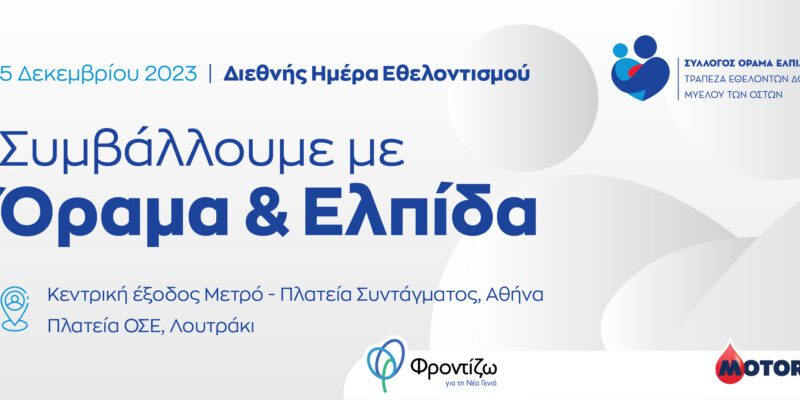 Στις 5 Δεκεμβρίου, η πολυσύχναστη Πλατεία Συντάγματος στην Αθήνα, στην κεντρική έξοδο του Μετρό και ώρες 09.00 – 19.00, και η Πλατεία ΟΣΕ στο Λουτράκι και ώρες 09.00 – 19.00, θα φιλοξενούν τα περίπτερα του Συλλόγου «ΟΡΑΜΑ ΕΛΠΙΔΑΣ» με τις ομάδες εθελοντών του Συλλόγου και του Ομίλου Motor Oil.