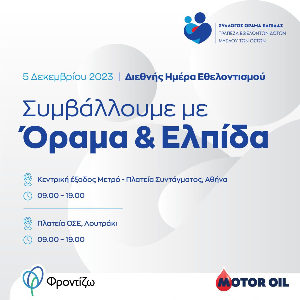 Με τη δύναμη της Ενέργειας, ο Όμιλος Motor Oil φροντίζει διαχρονικά για το κοινό μας Μέλλον. Ένα μέλλον που βασίζεται στην ευθύνη και την προσφορά και οφείλει να συμπορεύεται με την κατανόηση, την εκτίμηση, την αξιοπιστία, τη συνέπεια, τη συνέχεια, τη σταθερότητα. Η Motor Oil, λοιπόν, με υψηλό αίσθημα ευθύνης, προσκαλεί όσες και όσους το επιθυμούν στην Πλατεία Συντάγματος στην Αθήνα, στην κεντρική έξοδο του Μετρό, και στην Πλατεία ΟΣΕ στο Λουτράκι, ώρες 09.00 – 19.00, για να ενώσουμε τις δυνάμεις μας με ένα σπουδαία μήνυμα: Δώσε ΕΛΠΙΔΑ, Δώσε ΖΩΗ, γίνε εθελοντής δότης Μυελού των Οστών!