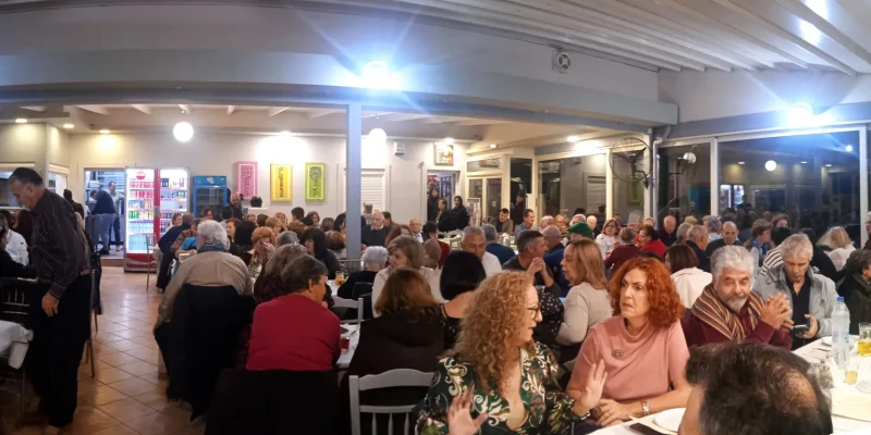 Η βραδιά στη συνέχεια κύλησε με τραγούδι και ζωντανή μουσική από τον Άρη Σταύρου, την Μυρτώ Καπώλη και το συγκρότημα «ΔιαΠασών», αλλά και πολύ χορό από τους συνδαιτημόνες.