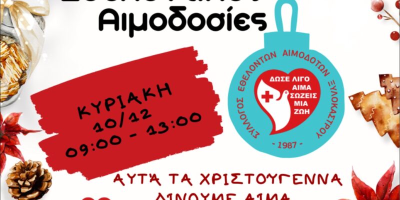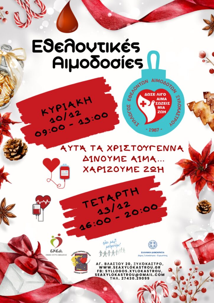 Με σύνθημα «Αυτά τα Χριστούγεννα δίνουμε Αίμα, Χαρίζουμε Ζωή» ο Σύλλογος Εθελοντων Αιμοδοτών Ξυλοκάστρου διοργανώνει Εθελοντικές Αιμοδοσίες στις 10 και 13 Δεκεμβρίου 2023, στα γραφεία του, στην οδό Αγίου Βλασίου 20, στο Ξυλόκαστρο.