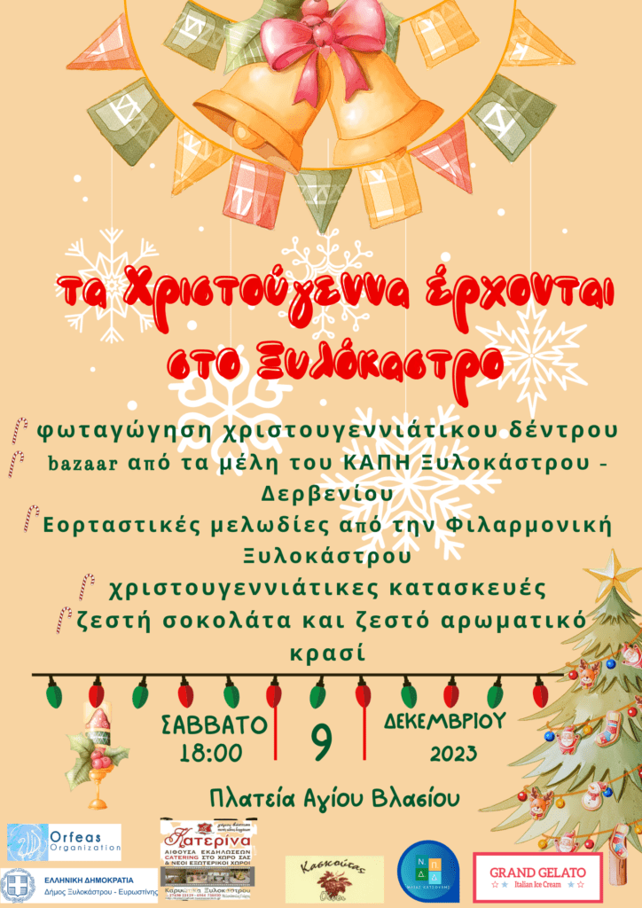 Πρωταγωνιστική θέση στις δραστηριότητες που έχουμε ετοιμάσει για εσάς έχει φυσικά η φωταγώγηση του χριστουγεννιάτικου δέντρου μας, το οποίο βρίσκεται στην κεντρική πλατεία του Ξυλοκάστρου, στον Άγιο Βλάσιο. Αναλυτικότερα, το πρόγραμμά μας περιλαμβάνει τις εξής δράσεις:
