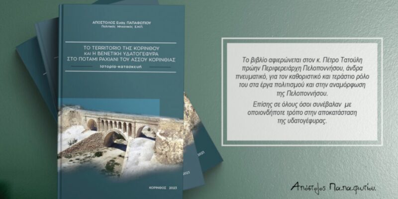 Κυκλοφόρησε το 4ο βιβλίο του Αποστόλου Ε. Παπαφωτίου, Πολιτικού Μηχανικού Ε.Μ.Π. με τίτλο «Το Territorio της Κορίνθου και η Βενετική Υδατογέφυρα στο ποτάμι Ράχιανι του Άσσου Κορινθίας (Ιστορία-κατασκευή)» Έκδοση “Καταγράμμα”, Κόρινθος 2023.
