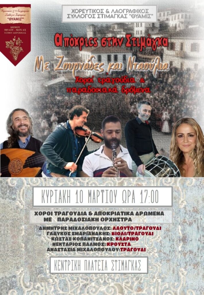 ΚΟΙΝΩΝΙΑ Απόκριες στην Στιμάγκα Κυριακή 10 Μαρτίου By sikionia 07/March/2024 Share 0 Ο Χορευτικός & Λαογραφικός Σύλλογος Στιμάγκας «Θύαμις», διοργανώνει στην κεντρική πλατεία του χωριού αποκριάτικο χορό την Κυριακή 10 Μαρτίου. Χορός, κέφι μουσική, εκπλήξεις και παραδοσιακά δρώμενα.Ελάτε να διασκεδάσετε μαζί μας σε ένα ξέφρενο χορό