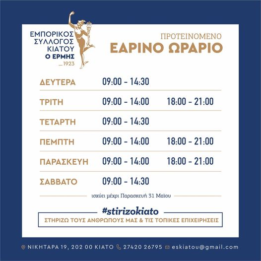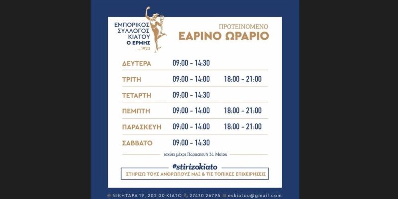 Σε ισχύ τίθεται από τη Δευτέρα 1η Απριλίου μέχρι και την Παρασκευή 31 Μαϊου το προτεινόμενο Εαρινό ωράριο λειτουργίας των καταστημάτων – μελών του Εμπορικού Συλλόγου Κιάτου.