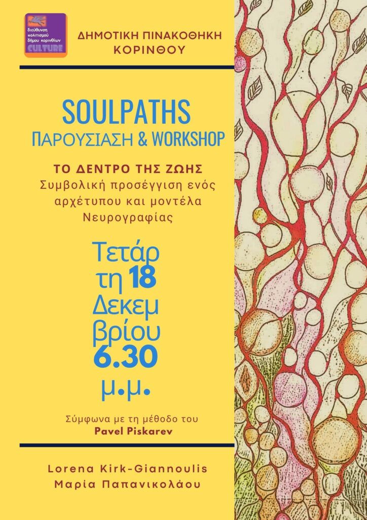 Η εκδήλωση πραγματοποιήθηκε την Τετάρτη 18/12 στην Δημοτική Πινακοθήκη της Κορίνθου με τίτλο: “Soulpaths”, Το δέντρο της ζωής ως σύμβολο στις παραδόσεις του κόσμου.