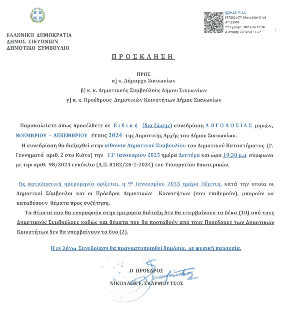 ΑΥΤΟΔΙΟΙΚΗΣΗΚΟΡΙΝΘΙΑΠΟΛΙΤΙΚΗ ΔΗΜΟΣ ΣΙΚΥΩΝΙΩΝ: Την Δευτέρα 13 Ιανουαρίου θα λογοδοτήσει η Δημοτική Αρχή By SIKIONIAGR 05/January/2025 Share 0