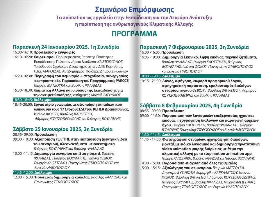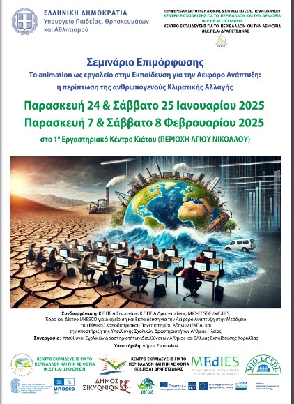 Το Κέντρο Εκπαίδευσης για το Περιβάλλον και την Αειφορία (Κ.Ε.ΠΕ.Α.) Σικυωνίων, το Κ.Ε.ΠΕ.Α Δραπετσώνας, το MIO-ECSDE /MEdIES (Μεσογειακό Γραφείο Πληροφόρησης για το Περιβάλλον τον Πολιτισμό και την Αειφόρο Ανάπτυξη) / Δίκτυο Μεσογειακή Εκπαιδευτική Πρωτοβουλία για το Περιβάλλον & την Αειφορία, η Έδρα και Δίκτυο UNESCO για Διαχείριση και Εκπαίδευση για την Αειφόρο Ανάπτυξη στην Μεσόγειο του Εθνικού Καποδιστριακού Πανεπιστημίου Αθηνών (ΕΚΠΑ), συνδιοργανώνουν τετραήμερο επιμορφωτικό δια ζώσης σεμινάριο, για 30 εκπαιδευτικούς των Δ/νσεων Α/θμιας & Β/θμιας Εκπαίδευσης Κορινθίας, με την υποστήριξη της Υπεύθυνης Σχολικών Δραστηριοτήτων Α/θμιας Ηλείας και σε συνεργασία με τους Υπευθύνους Σχολικών Δραστηριοτήτων των Διευθύνσεων Α/θμιας και Β/θμιας Εκπαίδευσης Κορινθίας με θέμα: «Το animation ως εργαλείο στην Εκπαίδευση για την Αειφόρο Ανάπτυξη: η περίπτωση της ανθρωπογενούς Κλιματικής Αλλαγής»