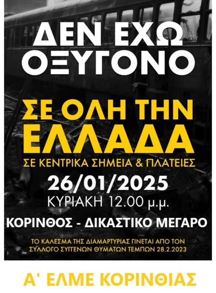 Την Κυριακή 26 Ιανουαρίου 2025, με αφορμή το αγωνιστικό κάλεσμα του Συλλόγου Πληγέντων Δυστυχήματος Τεμπών στις 12 το μεσημέρι στο Σύνταγμα, φορείς, σύλλογοι  και οργανώσεις  θα πραγματοποιήσουν ανάλογες  κινητοποιήσεις σε όλη την Ελλάδα. Η Α΄ ΕΛΜΕ Κορινθίας την ίδια ώρα  θα συμμετάσχει  στην  κινητοποίηση στην Κόρινθο, έξω από το Δικαστικό Μέγαρο  για  να εκφράσει τη συμπαράστασή της στις οικογένειες των συνανθρώπων μας που τόσο άδικα έχασαν τη ζωή τους ή τραυματίστηκαν καθώς και τη διαμαρτυρία της για την εγκληματική αυτή ενέργεια και για τη συγκάλυψη που επιχειρείται.