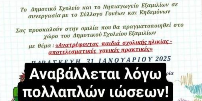 Η προγραμματισμένη ομιλία με θέμα «Ανατρέφοντας παιδιά σχολικής ηλικίας – Αποτελεσματικές γονικές πρακτικές», που επρόκειτο να πραγματοποιηθεί στο Δημοτικό Σχολείο και το Νηπιαγωγείο Εξαμιλίων, αναβάλλεται λόγω των πολλαπλών ιώσεων που έχουν επηρεάσει μαθητές, εκπαιδευτικούς και γονείς.