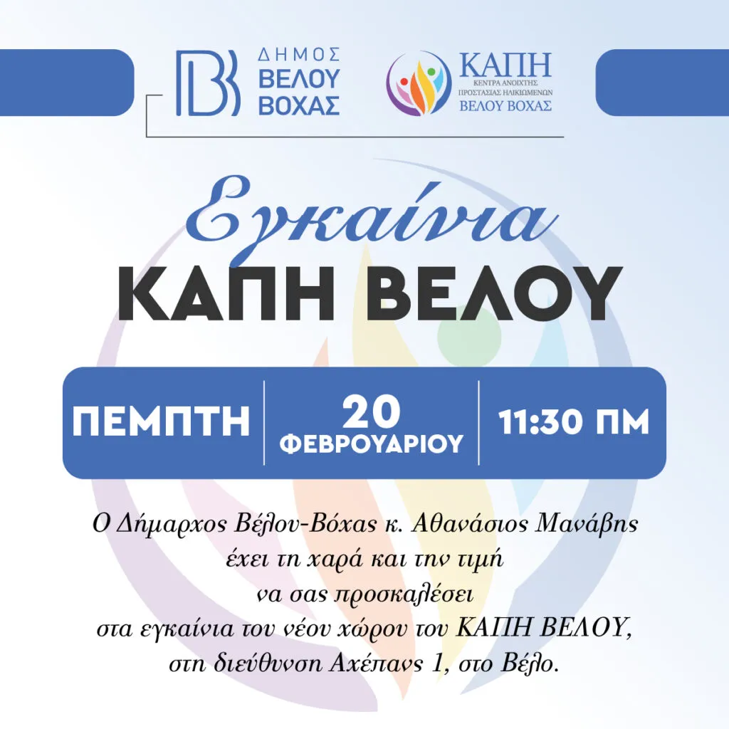 Ο Δήμος Βέλου-Βόχας και το Κέντρο Ανοικτής Προστασίας Ηλικιωμένων (ΚΑΠΗ) Βέλου-Βόχας ανακοινώνουν με χαρά τα εγκαίνια του νέου χώρου του ΚΑΠΗ Βέλου, που θα πραγματοποιηθούν την Πέμπτη 20 Φεβρουαρίου στις 11:30 π.μ., στις νέες εγκαταστάσεις επί της οδού Αχέπανς 1, στο Βέλο.