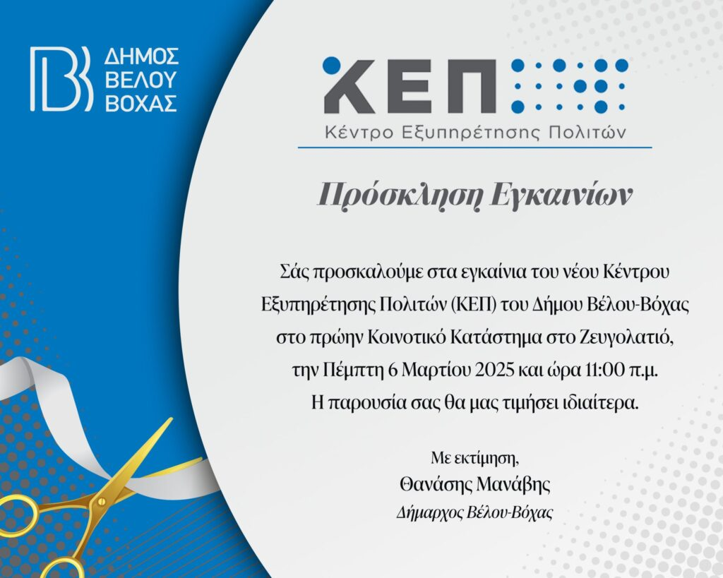 ΚΟΙΝΩΝΙΑΚΟΡΙΝΘΙΑ Αύριο τα εγκαίνια του νέου ΚΕΠ στο Ζευγολατιό By SIKIONIAGR 05/March/2025 Share 0 Τα εγκαίνια του νέου Κέντρου Εξυπηρέτησης Πολιτών (ΚΕΠ) στο Ζευγολατιό θα γίνουν αύριο (Πέμπτη) το πρωί, στις 11.00! Η έδρα του νέου ΚΕΠ είναι στο πρώην Κοινοτικό Κατάστημα Ζευγολατιού.
