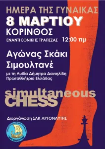 Με μια ξεχωριστή εκδήλωση θα γιορτάσει την Ημέρα της Γυναίκας στις 8 Μαρτίου ο Σκακιστικός Σύλλογος “Αργοναύτης”. Στον πεζόδρομο απέναντι από την Εθνική Τράπεζα, στις 12.00 το πρωί η Πρωταθλήτρια Νεανίδων Ελλάδας, Λυδία Δανιηλίδη, θα αντιμετωπίσει σε έναν αγώνα simultane, γυναίκες αντιπάλους κάθε ηλικίας.
