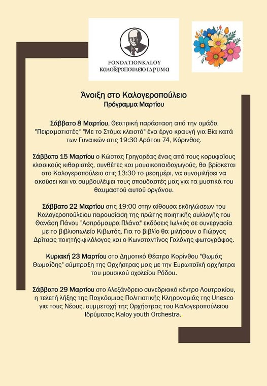 ΚΟΙΝΩΝΙΑΚΟΡΙΝΘΙΑΠΟΛΙΤΙΣΜΟΣ Άνοιξη στο Καλογεροπούλειο ίδρυμα – Δείτε το πρόγραμμα By SIKIONIAGR 07/March/2025 Share 0 Θέατρο, Μουσική, ποίηση! Απ΄όλα έχει αυτή τη Άνοιξη στο Καλογεροπούλειο ίδρυμα. Δείτε το πρόγραμμα, αναλυτικά: