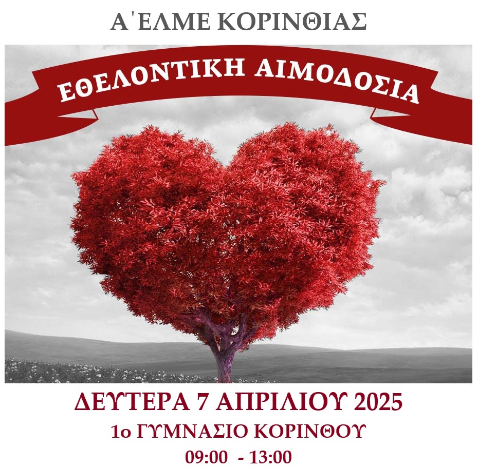 Ημέρα ΑΙΜΟΔΟΣΙΑΣ ορίζεται η Δευτέρα 7 Απριλίου 2025 και ώρα 09:00΄ π.μ έως 13:00΄ μ.μ. στην αίθουσα εκδηλώσεων του 1ου Γυμνασίου Κορίνθου.