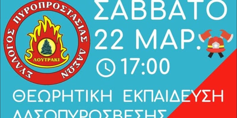 Ο Σύλλογος Εθελοντών Πυροπροστασίας Δασών Λουτρακίου – Περαχώρας συνεχίζει τη δράση του ενόψει της νέας αντιπυρικής περιόδου. Το Σάββατο 22 Μαρτίου 2025, στις 17:00, θα πραγματοποιήσει στα γραφεία του την καθιερωμένη ετήσια θεωρητική εκπαίδευση Δασοπυρόσβεσης για τα μέλη του.