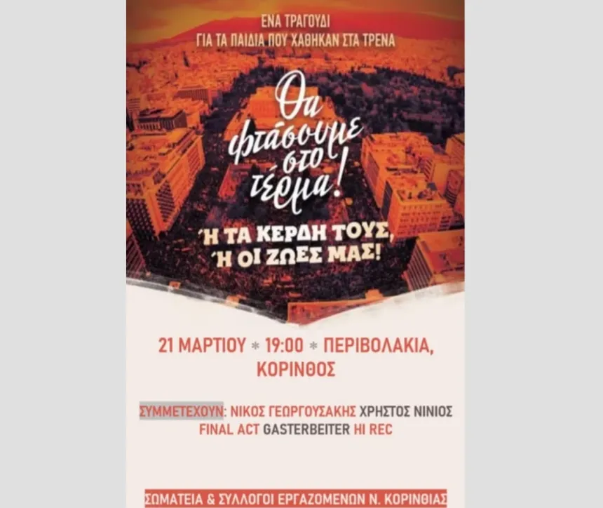 Ζωντανό διατηρεί η κοινωνία το αίτημα για Δικαιοσύνη αλλά και Δικαίωση των 57 θυμάτων των Τεμπών. Και για τον λόγο αυτό την Παρασκευή 21 Μαρτίου στις 7 το απόγευμα, στην πλατεία Παναγή Τσαλδάρη “Περιβολάκια”, θα γίνει μία ακόμα συναυλία.