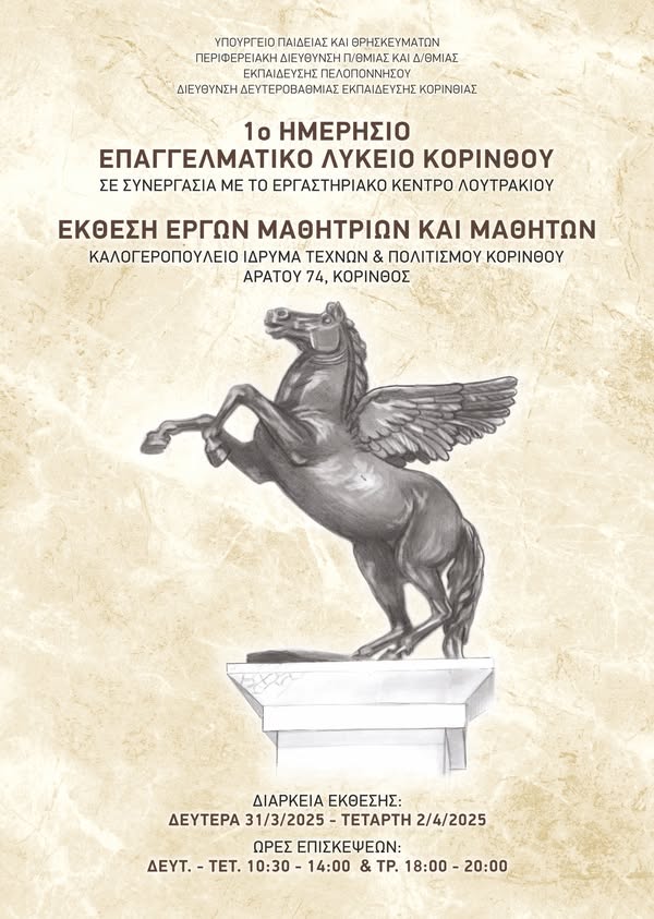 Το 1ο Ημερήσιο Επαγγελματικό Λύκειο Κορίνθου, σε συνεργασία με το Εργαστηριακό Κέντρο Λουτρακίου, διοργανώνει την Έκθεση Έργων Μαθητριών και Μαθητών, η οποία θα φιλοξενηθεί στο Καλογεροπούλειο Ίδρυμα Τεχνών & Πολιτισμού Κορίνθου από τη Δευτέρα 31 Μαρτίου έως την Τετάρτη 2 Απριλίου 2025.