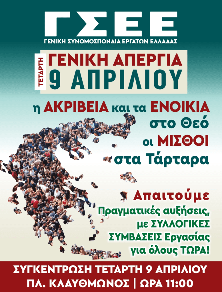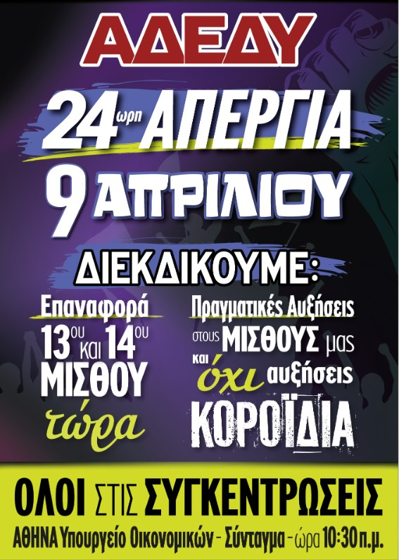 24ωρη γενική απεργία ανακοίνωσαν ΓΣΕΕ και ΑΔΕΔΥ για τις 9 Απριλίου με πρωταρχικό αίτημα την επαναφορά του 13ου και του 14ου μισθού αλλά και αυξήσεις στις αποδοχές.