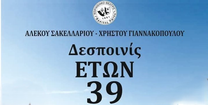Το Κορινθιακό Θέατρο «Βασίλης Ρώτας» παρουσιάζει την πολυαναμενόμενη παράσταση «Δεσποινίς Ετών 39», γραμμένη από τον κλασικό του είδους Αλέκο Σακελλάριο σε συνεργασία με τον Χρήστο Γιαννακόπουλο. Ένα έργο που, μέσα από το πρίσμα του χιούμορ και της τρυφερότητας, φωτίζει τα μικρά και μεγάλα διλήμματα μιας γυναίκας στη «στεγνή» δεκαετία των τριάντα εννιά ετών.