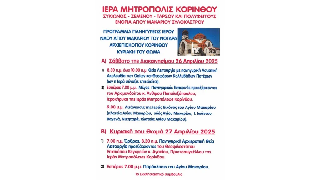 ΚΟΙΝΩΝΙΑΚΟΡΙΝΘΙΑ Πρόγραμμα Πανηγύρεως Ιερού Ναού Αγίου Μακαρίου του Νοταρά By SIKIONIAGR 26/April/2025 Share 0