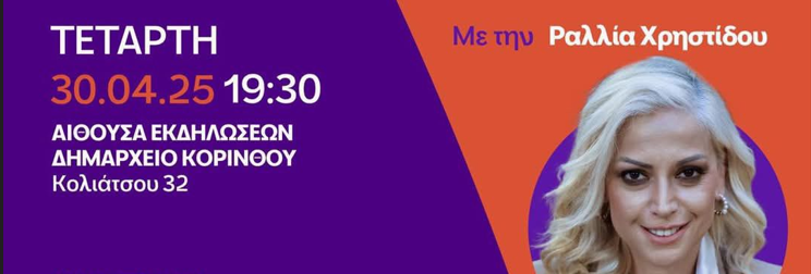 Το “Κίνημα Δημοκρατίας” διοργανώνει ανοιχτή πολιτική εκδήλωση την Τετάρτη 30 Απριλίου 2025, στις 19:30, στην αίθουσα εκδηλώσεων του Δημαρχείου Κορίνθου (Κολιάτσου 32), με προσκεκλημένη ομιλήτρια τη Ραλλία Χρηστίδου, καλλιτέχνιδα και πρώην βουλευτή.