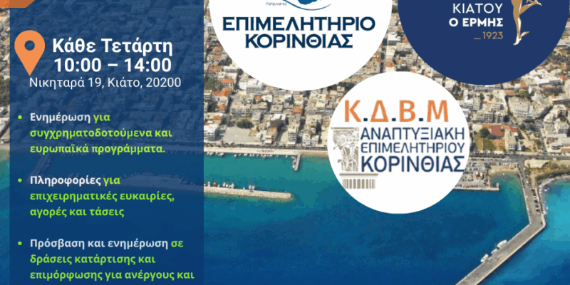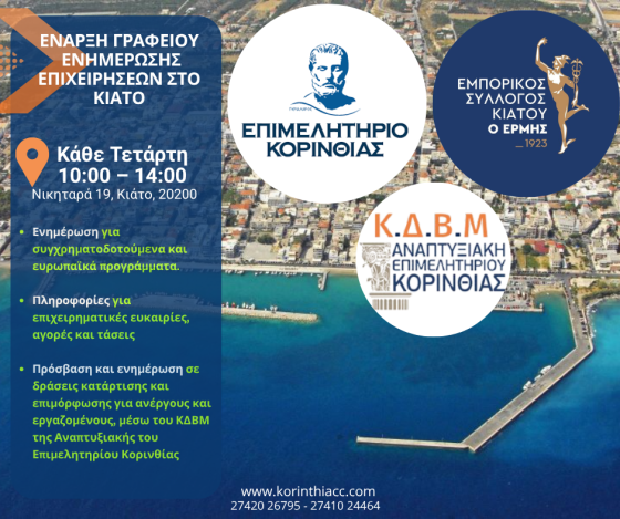 Το Επιμελητήριο Κορινθίας, σε συνεργασία με τον Εμπορικό Σύλλογο Κιάτου “Ο Ερμής”, ανακοινώνει τη δημιουργία Γραφείου Ενημέρωσης Επιχειρήσεων στο Κιάτο, με στόχο την ενίσχυση της επικοινωνίας και την παροχή πρακτικής υποστήριξης στις επιχειρήσεις της Δυτικής Κορινθίας.