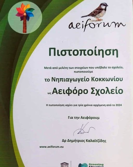 Το Νηπιαγωγείο Κοκκωνίου απέσπασε την Πιστοποίηση Αειφόρου Σχολείου για την τριετία 2024-2027, έπειτα από αξιολόγηση του συνόλου των δράσεών του από τη Συντονιστική Επιτροπή και την Παιδαγωγική Ομάδα του Δικτύου Αειφόρων Σχολείων.