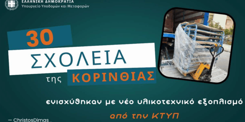 Με σημαντική ενίσχυση σε υλικοτεχνικό εξοπλισμό ξεκίνησε η φετινή σχολική χρονιά για 30 σχολικές μονάδες στην Κορινθία, χάρη στη συνεργασία της ΚΤΥΠ Α.Ε. (Κτιριακές Υποδομές) με το Υπουργείο Υποδομών και Μεταφορών. Η πρωτοβουλία αυτή στοχεύει στη βελτίωση των σχολικών υποδομών, εξασφαλίζοντας πιο σύγχρονες και ασφαλείς συνθήκες μάθησης για εκατοντάδες μαθητές του νομού.