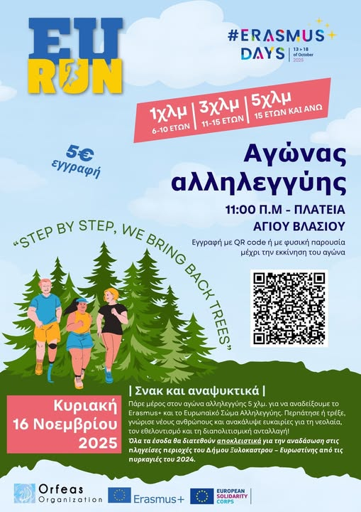 Στο πλαίσιο των Erasmus Days 2025, ο ΟΡΦΕΑΣ Α.Μ.Κ.Ε. και οι εθελοντές του @europeansolidaritycorpsgr διοργανώνουν τον αγώνα δρόμου “EUrun”, με στόχο την προώθηση της αθλητικής συμμετοχής, την ενίσχυση της αλληλεγγύης και την υποστήριξη της τοπικής κοινωνίας.