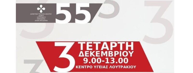 Την Τετάρτη 3 Δεκεμβρίου 2025, από τις 09:00 το πρωί έως τις 13:00 το μεσημέρι, θα πραγματοποιηθεί η 55η Εθελοντική Αιμοδοσία της Δημοτικής Τράπεζας Αίματος του Δήμου Λουτρακίου – Περαχώρας – Αγίων Θεοδώρων. Η δράση θα γίνει στο Κέντρο Υγείας Λουτρακίου, έναν χώρο κατάλληλο και πλήρως εξοπλισμένο για την ασφαλή διεξαγωγή της διαδικασίας.