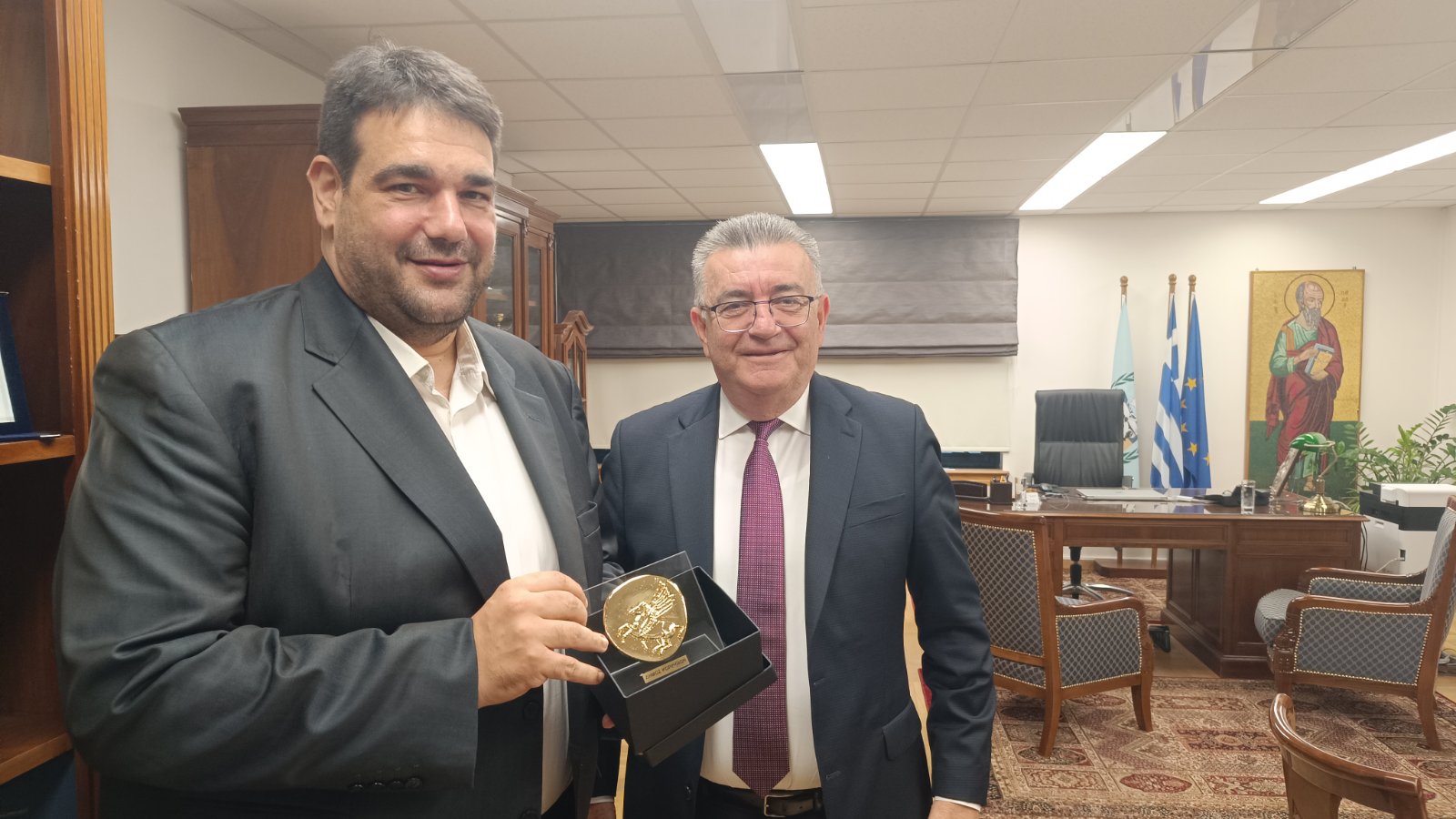 Στο πλαίσιο της επίσκεψης, ο Δήμαρχος προσέφερε στον Υπουργό έργο τέχνης με τον Πήγασο, σύμβολο της Αρχαίας Κορίνθου και απεικόνιση που παραπέμπει στο αρχαίο κορινθιακό νόμισμα.