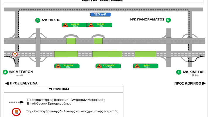 Στο διάστημα αυτό τα συγκεκριμένα οχήματα θα εξυπηρετούνται μέσω της Παλαιάς Εθνικής Οδού μεταξύ των κόμβων Μεγάρων και Κινέτας, όπως φαίνεται στο ακόλουθο σχηματικό διάγραμμα
