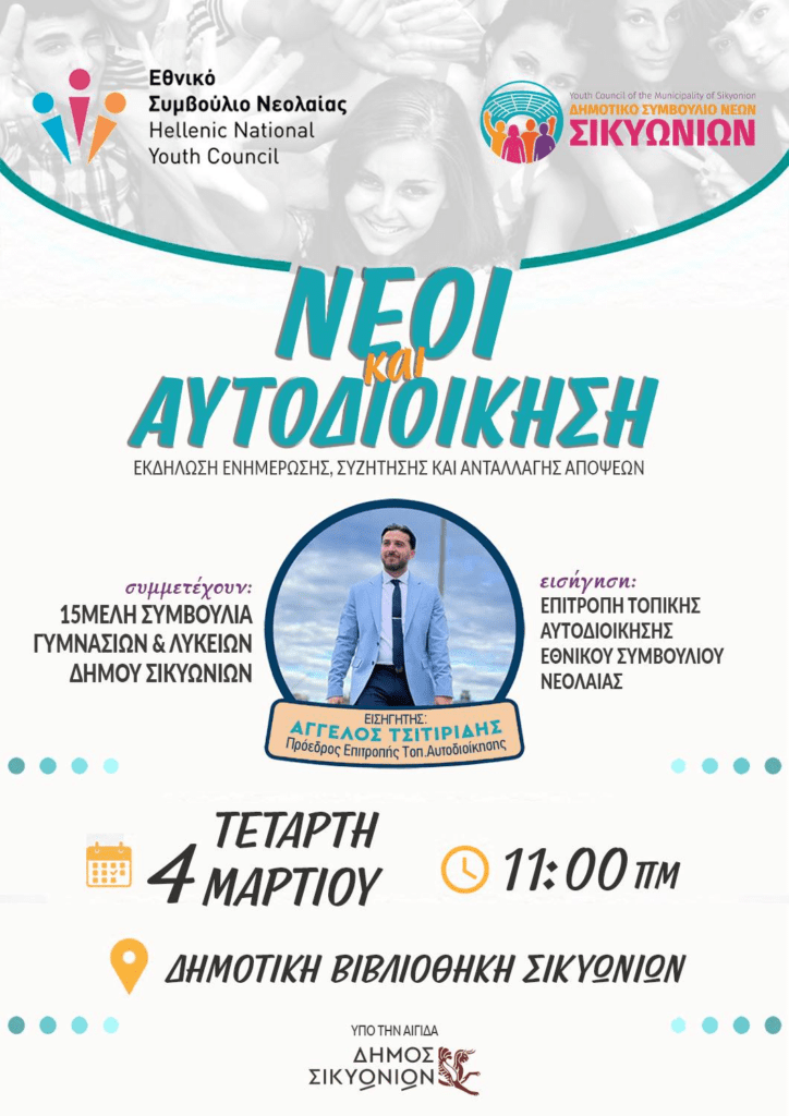 Στο πλαίσιο αυτό, το Δημοτικό Συμβούλιο Νέων Σικυωνίων προχωρά σε ημερίδα ενημέρωσης σε συνεργασία με την Επιτροπή Τοπικής Αυτοδιοίκησης του Εθνικού Συμβουλίου Νεολαίας. Στόχος είναι οι μαθητές να γνωρίσουν καλύτερα τις δυνατότητες συμμετοχής τους στα τοπικά ζητήματα, να αποκτήσουν μεγαλύτερη αυτοπεποίθηση στην έκφραση των απόψεών τους και να δουν τον ρόλο της νεολαίας στη λειτουργία της τοπικής