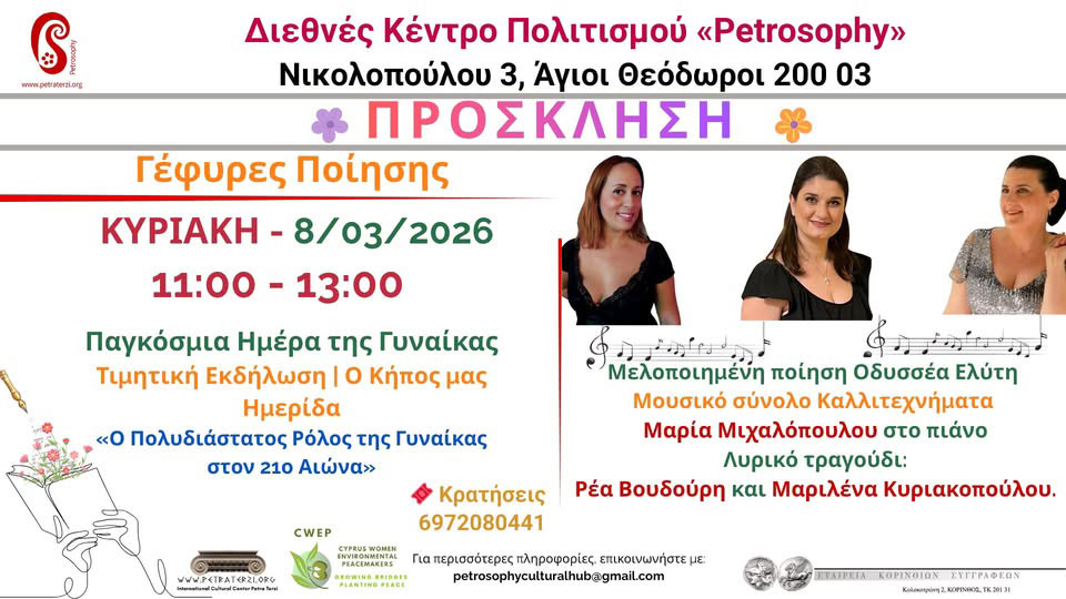 Με αφορμή την Παγκόσμια Ημέρα της Γυναίκας, το Διεθνές Κέντρο Πολιτισμού Petrosophy στους Αγίους Θεοδώρους διοργανώνει μια ξεχωριστή τιμητική εκδήλωση και ημερίδα με τίτλο «Ο Πολυδιάστατος Ρόλος της Γυναίκας στον 21ο Αιώνα», την Κυριακή 8 Μαρτίου 2026, από τις 11:00 έως τις 13:00.
